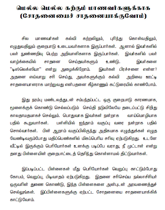 We come across students who have learning disabilities, slow to understand and some are dyslexic. In spite of their disabilities they do show signs of excellence when they are dealt with personal care. It is important that we know their disability and treat them according to their level of intelligence.